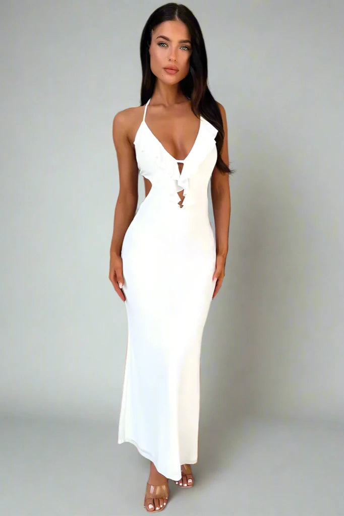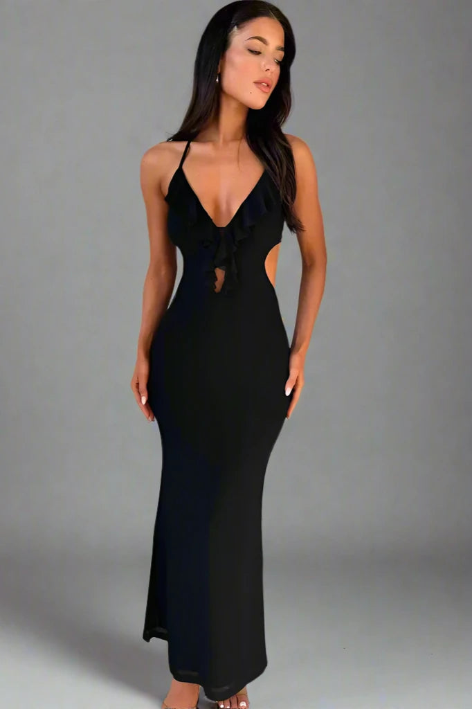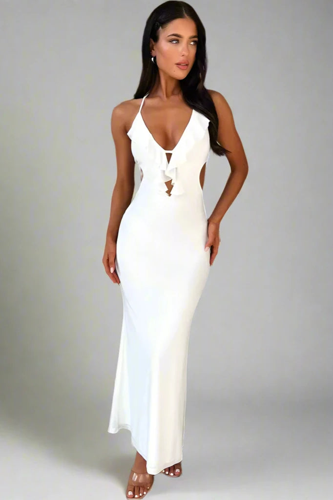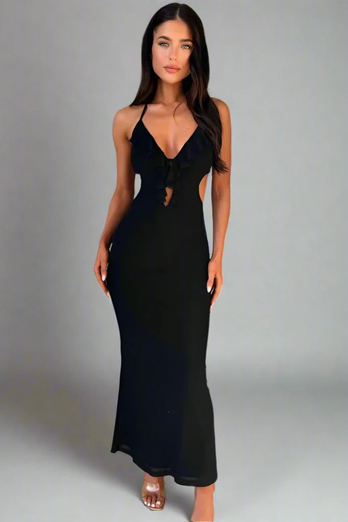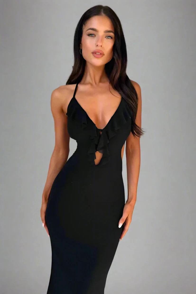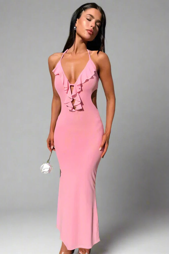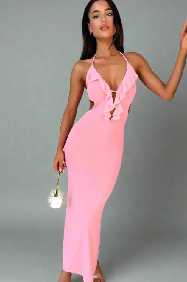 Learn MoreEmbrace femininity with this soft pink bodycon dress that highlights the figure while exuding a romantic charm. The dress features delicate ruffle detailing along the plunging neckline and open back, adding a playful touch. Ideal for a summer evening or a special date night, this dress is a blend of sweetness and urbanity.