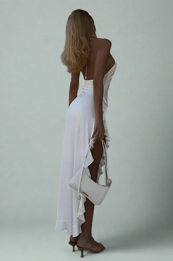Learn MoreThis asymmetrical white dress is a perfect blend of romance and modern design. The single-shoulder strap adorned with floral detail, combined with the cascading ruffles down the side, creates a soft yet striking look. Ideal for weddings, garden parties, or any modish occasion.