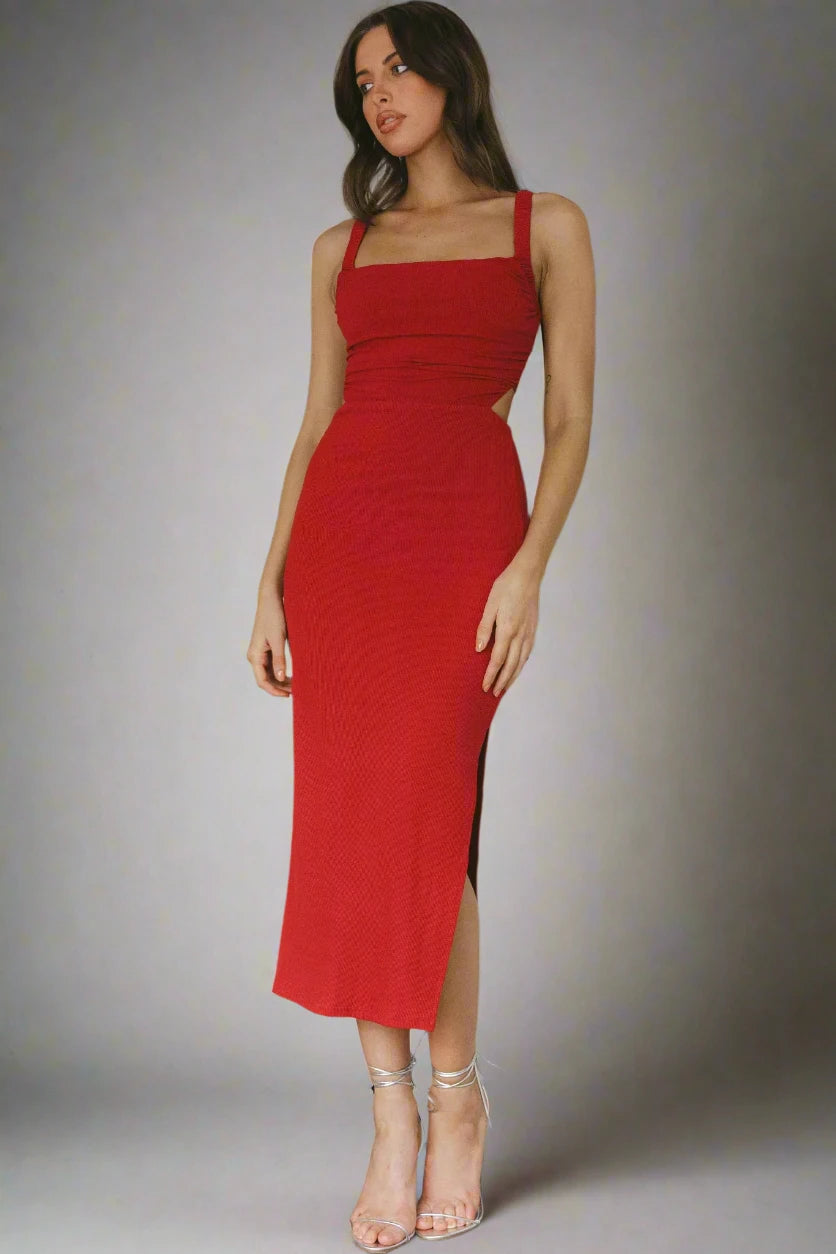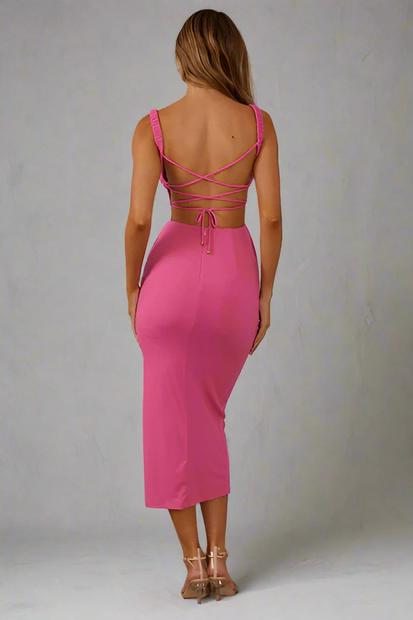 Learn MoreShimmer and shine with our Lucille Midi Dress. This dress features a flattering square neckline and ruched detailing that accentuates your curves. The vibrant pink hue and the elegant side slit add a touch of sophistication, making it perfect for both daytime and evening events. Pair it with your favorite heels for a look that’s both chic and confident.