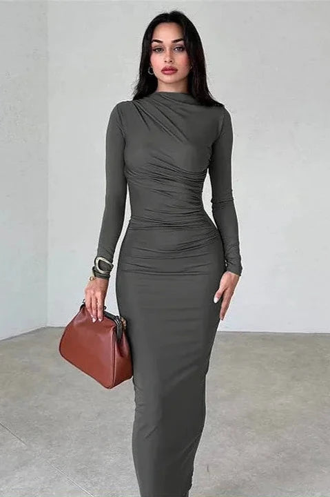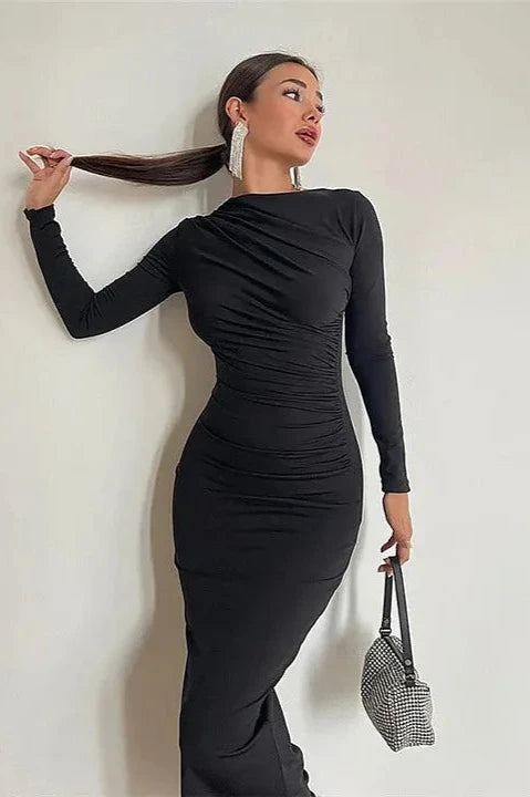 Learn MoreAdd a sparkle to your night with the Margaux Long-Sleeve Midi Dress. This dress features a figure-flattering ruched design that accentuates your curves. The long sleeves and midi length create a sleek and sophisticated look, perfect for evening events or a night out. The dress pairs effortlessly with bold accessories and heels for a chic ensemble.