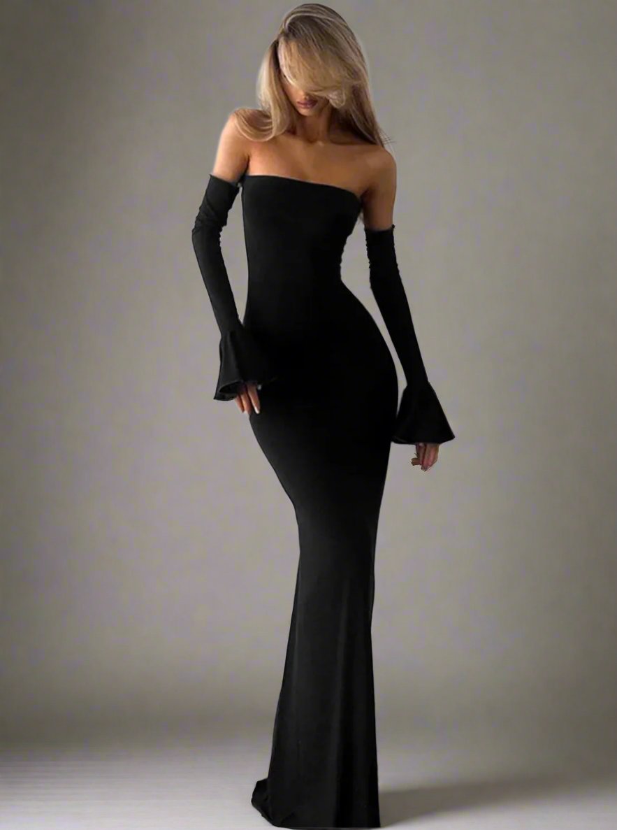 Learn MoreAdd a hint of luxury with the Mélanie Maxi Dress. This dress exudes elegance with its off-shoulder neckline and form-fitting silhouette that beautifully accentuates your curves. The standout feature is the dramatic flare sleeves that add a touch of vintage glamour to the modern design. Perfect for an upscale evening event, pair this dress with sleek heels and minimal jewelry to let the dress take center stage.
