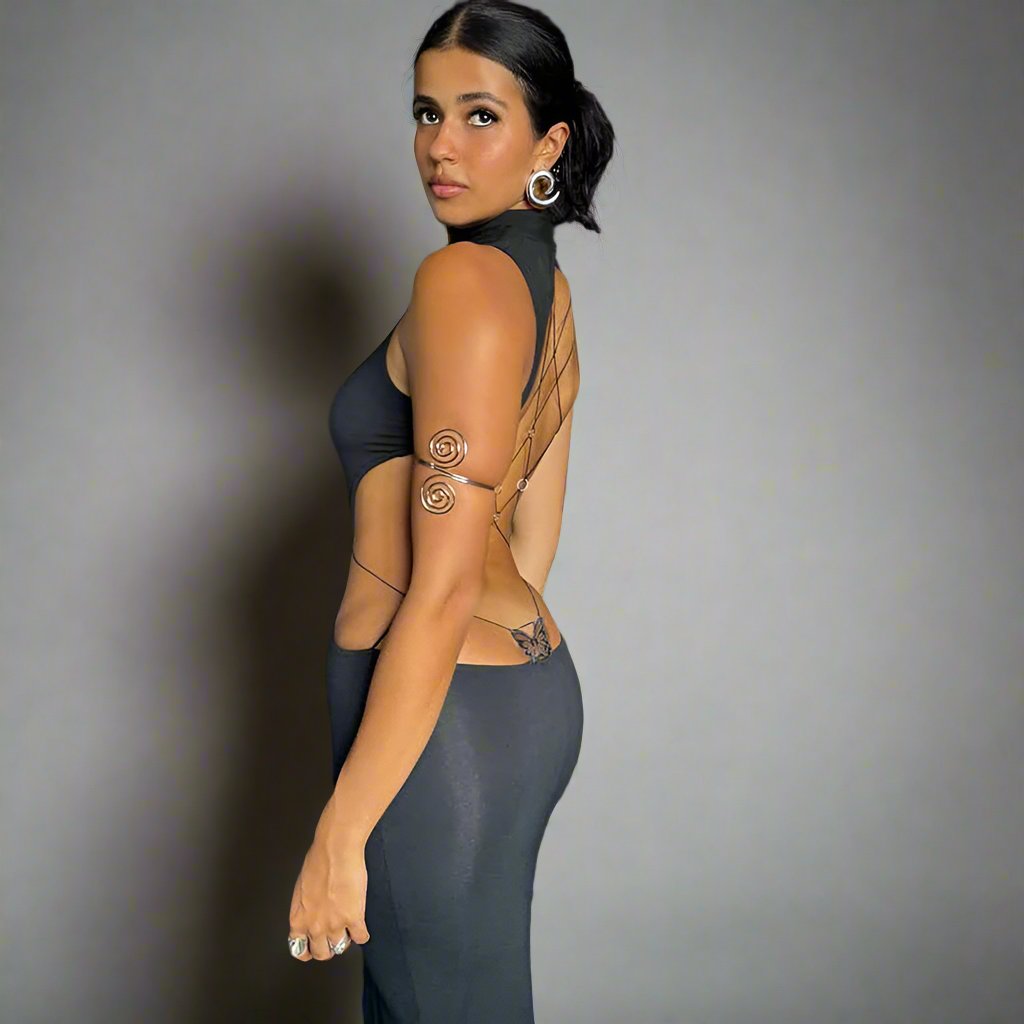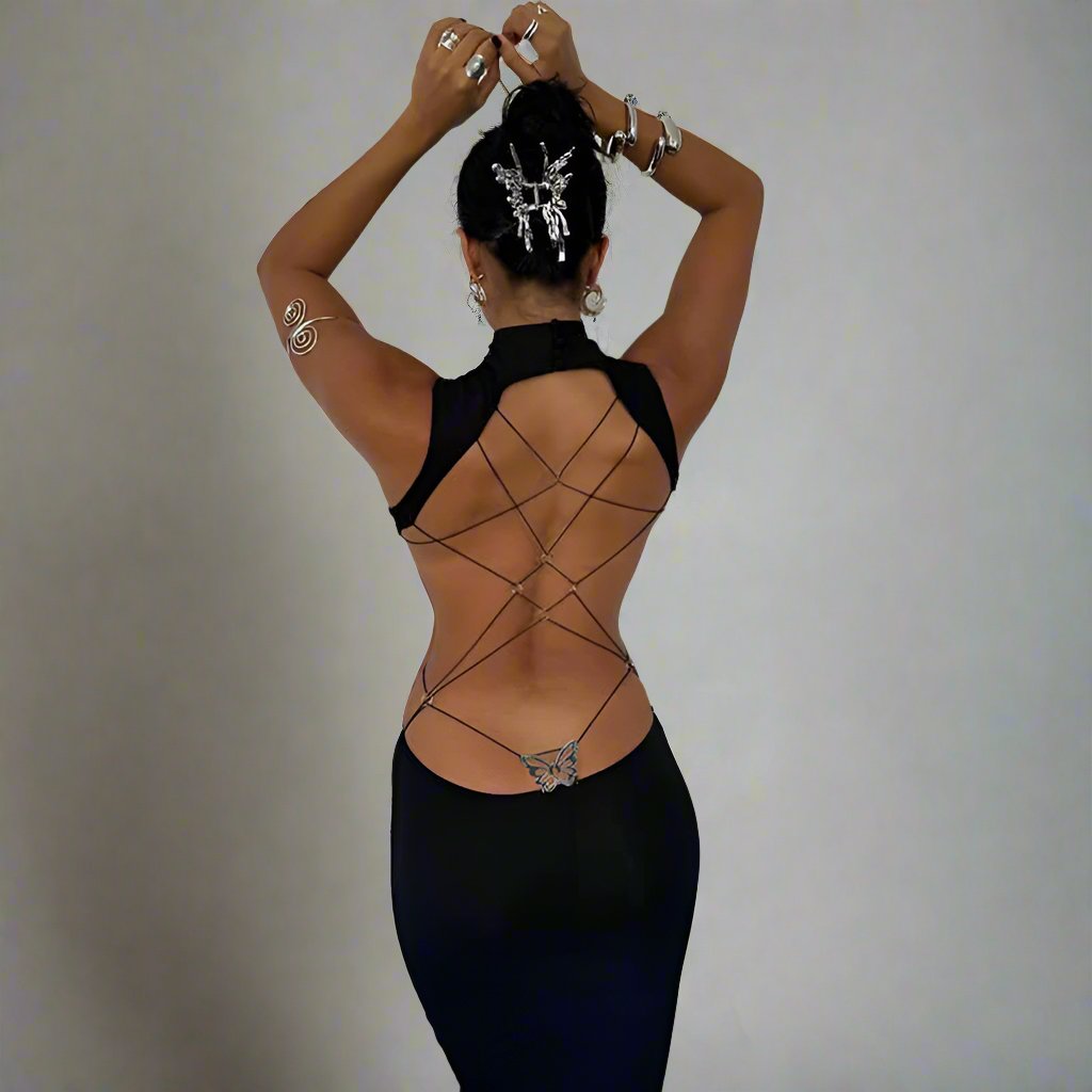 Learn MoreOur Rosalee Maxi Dress is a daring and avant-garde ensemble that pushes the boundaries of fashion, perfect for those who want to make a bold and unforgettable statement. The sleek black fabric contours the body, while the backless design, adorned with intricate string detailing, adds a provocative twist. The high neckline contrasts with the open back, creating a striking balance between sophistication and allure. Paired with statement jewelry, this outfit is not just clothing—it’s a work of art designed for the fearless fashionista who isn’t afraid to stand out.