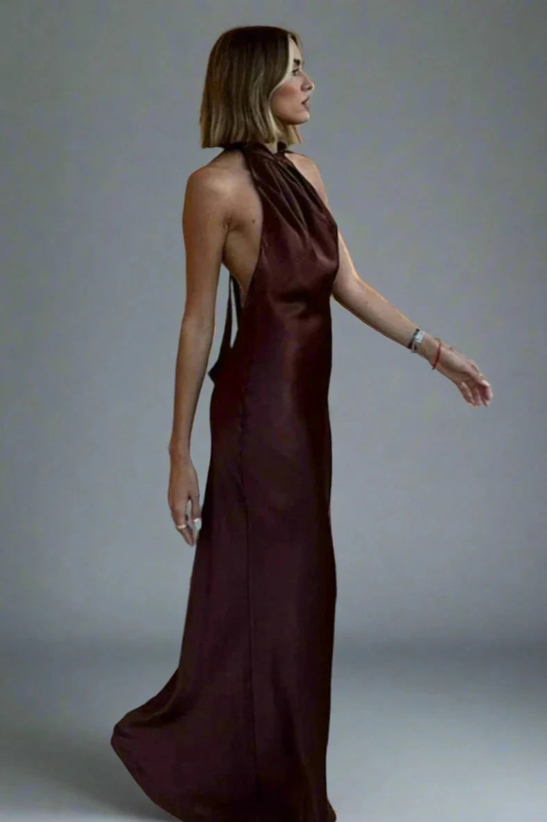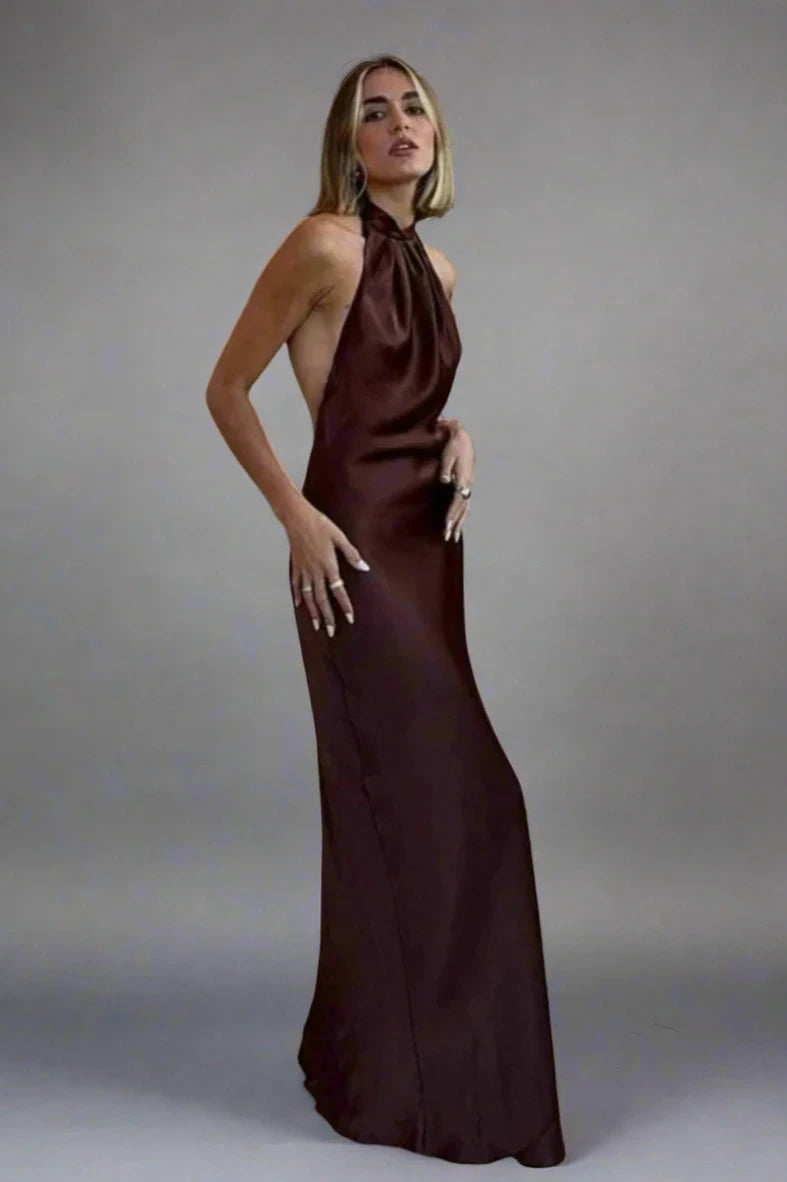 Learn MoreUnveil your sense of style with this striking Sydney Halter-Neck Dress, a masterpiece in deep, luxurious brown satin. This backless dress drapes elegantly along the body, highlighting your silhouette while offering a touch of modern sophistication. The smooth, minimalist design makes it the perfect choice for an upscale evening event or a romantic dinner. Elevate your look with statement jewelry and let the luxurious fabric do the talking as you make a memorable entrance.